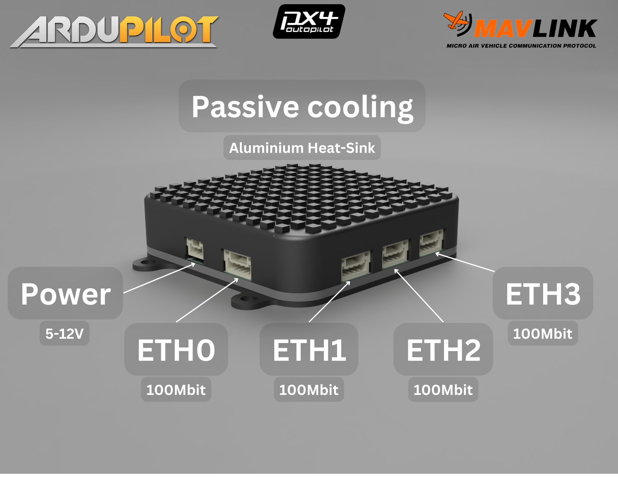 It is engineered for mission-critical applications with wide voltage input, passive cooling, and rugged mechanical design. Whether you’re building a high-end drone, a UGV, or a robotics platform, AeroSwitch provides the essential Ethernet backbone for seamless data communication between autopilots, companion computers, sensors, and other IP-based devices.
